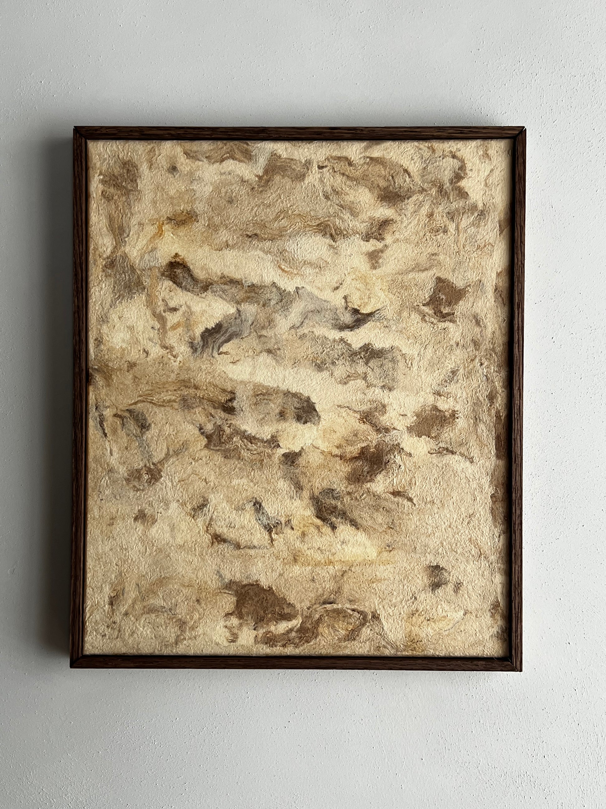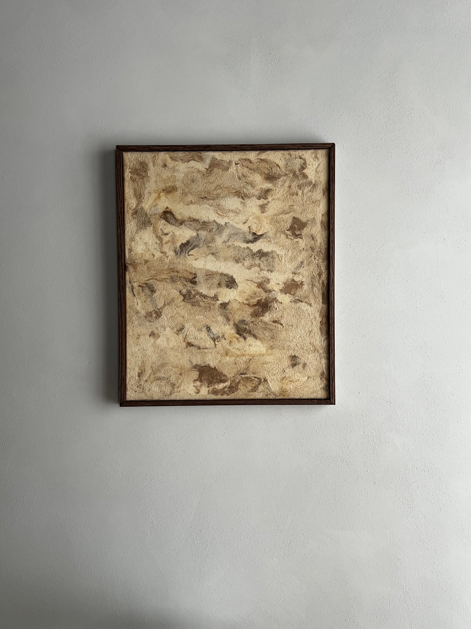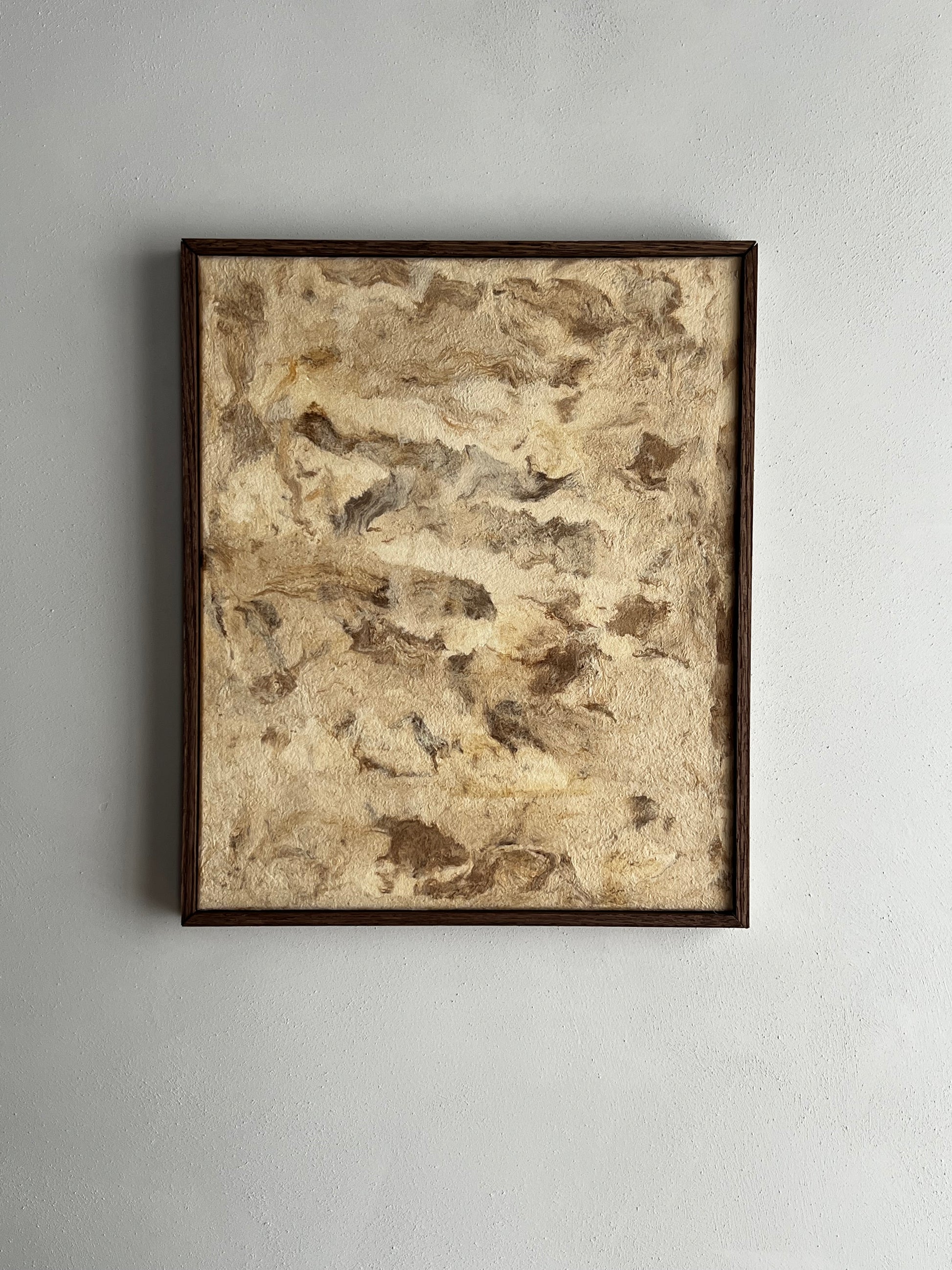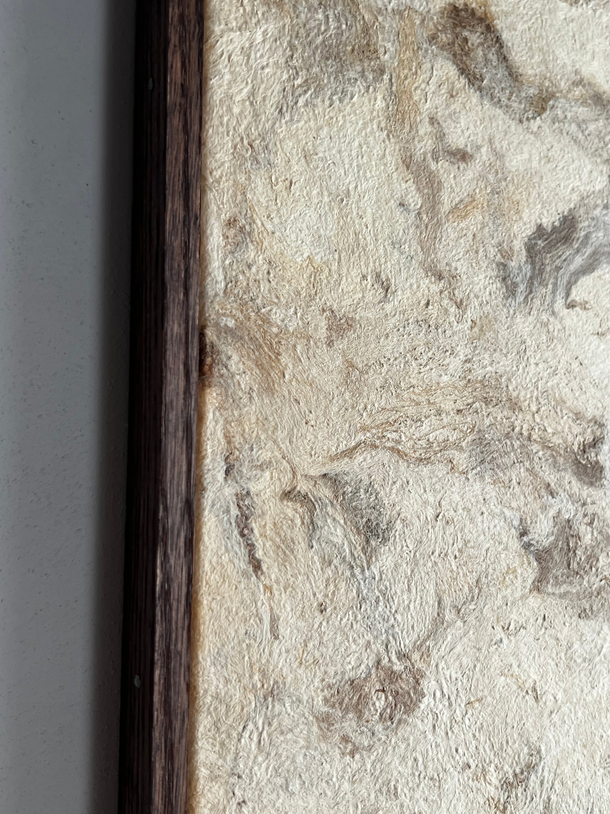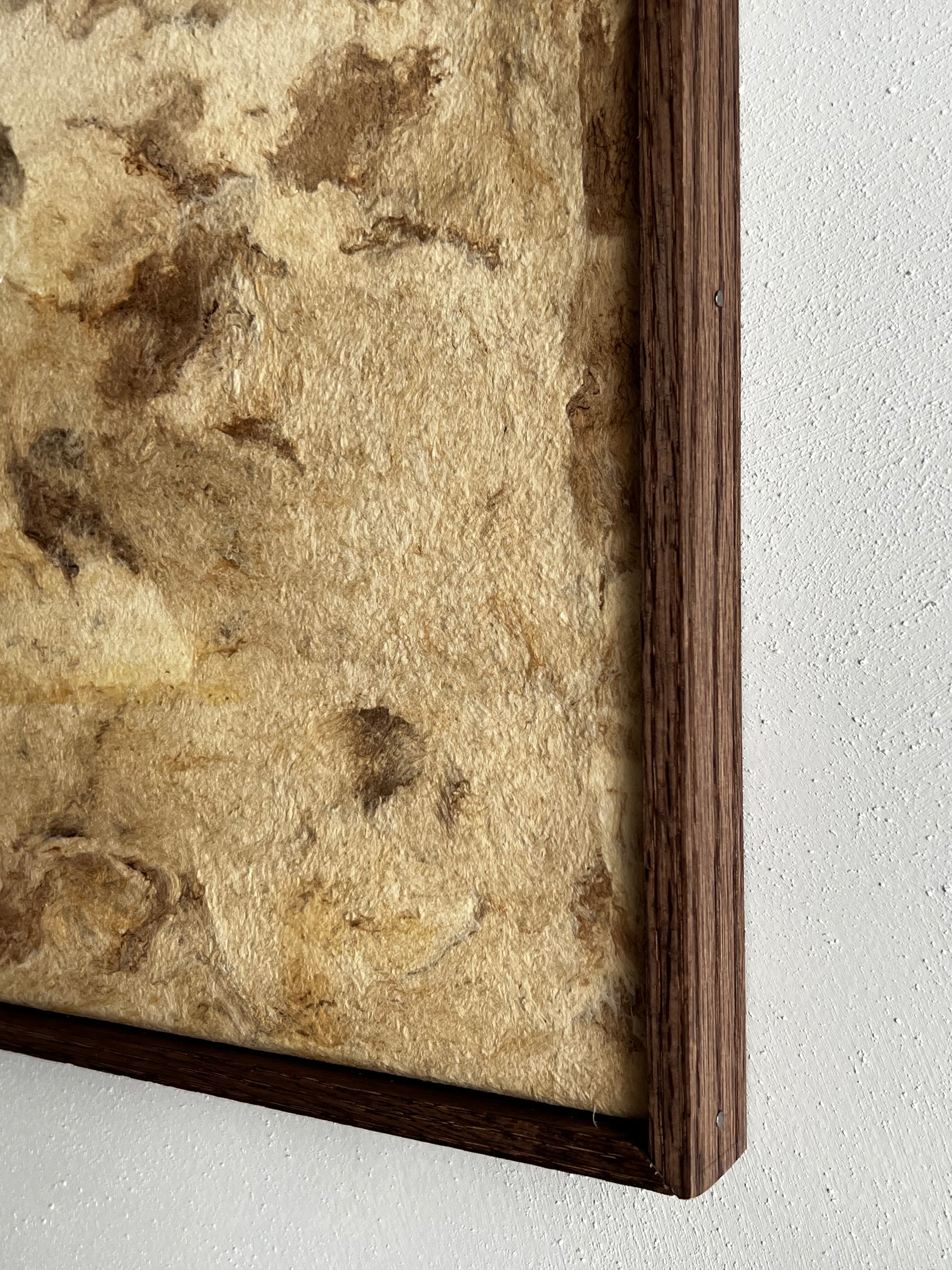 Pièce unique faite à partir de papier d'écorce rare, façonné à la main par des peuples indigènes du Mexique. Céline utilise sa texture singulière, empreinte de fibres naturelles et révélant de subtiles marbrures brunes pour évoquer la délicatesse d'une toile peinte, prête à être contemplée comme une œuvre d'art.